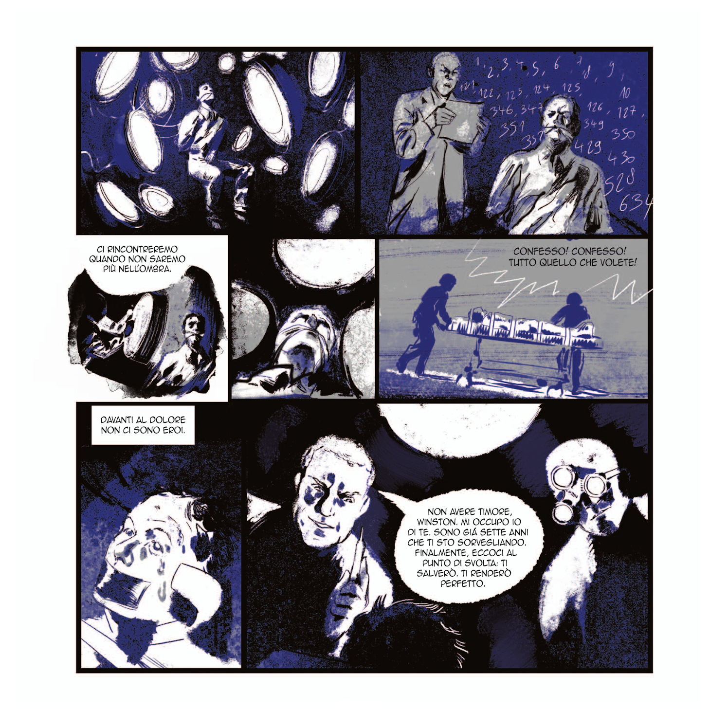 1984, il monumento della letteratura di George Orwell, in un adattamento a fumetti dall’angosciante potere evocativo… Un’opera in cui le immagini si uniscono vorticosamente alle parole dell’intramontabile distopia orwelliana. Stefano Zecchi scrive, nella prefazione dell’edizione italiana del libro di Xavier Coste, che «1984 è un’atroce denuncia non solo del totalitarismo, della comunicazione globale e del Grande Fratello che ci osserva instancabile da chissà dove, ma, in particolare, della stupidità e della miseria dell’uomo. Di un uomo incapace di credere in se stesso, di avere coraggio, di pensare in grande, di un uomo in grado di difendere soltanto la propria miserabile (spiritualmente) mediocrità, pauroso di perdere la sanità del corpo, vile e traditore. Una lucida, drammatica descrizione di un’umanità indifferente e vile, disposta a consegnare la propria persona a chiunque pur di liberarsi dal peso della responsabilità di scegliere e decidere con la propria testa. Uomini e donne disposte a consegnare la loro storia, la propria identità a chiunque se ne voglia impadronire, per qualunque interesse e finalità. Questo è 1984: una spaventosa e inappellabile accusa dell’essere umano».